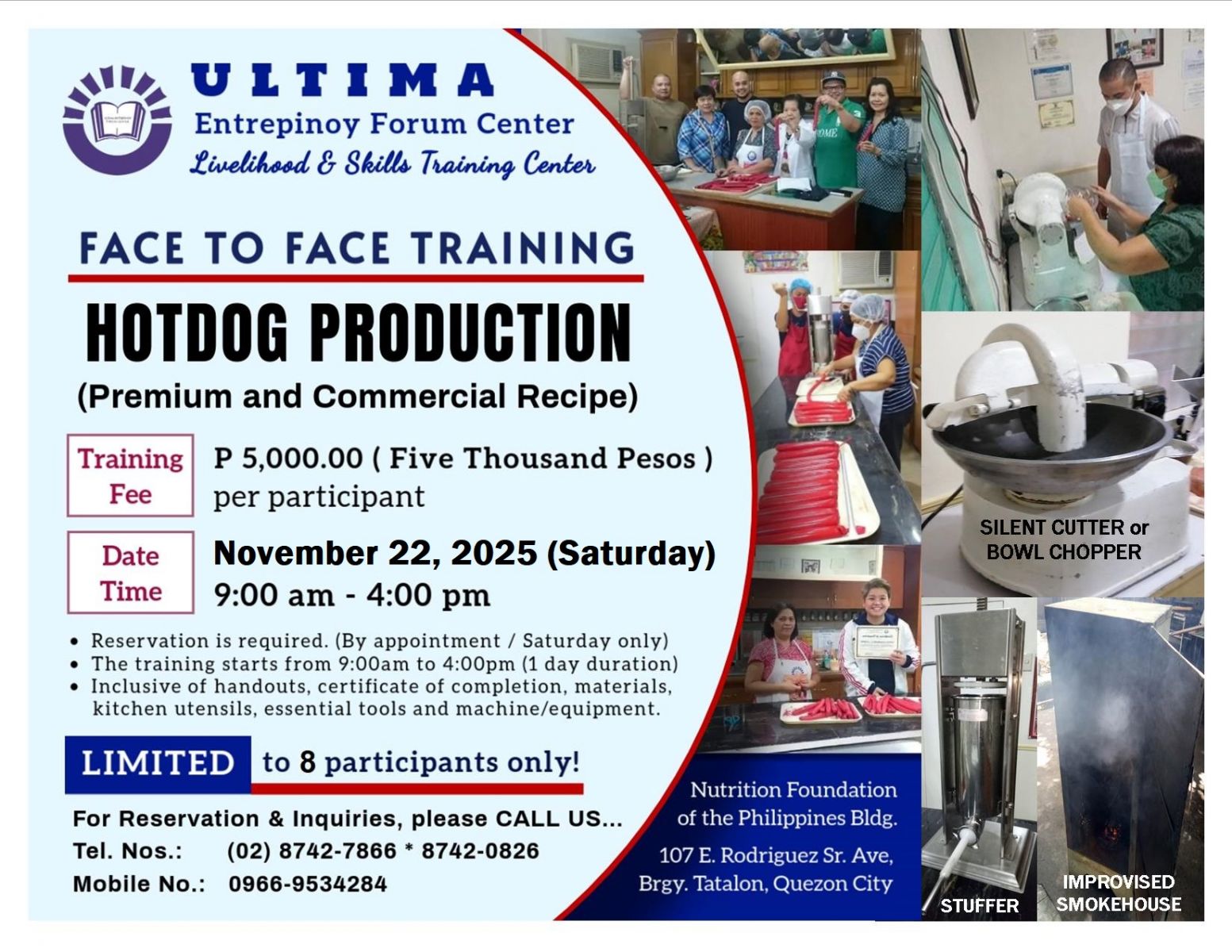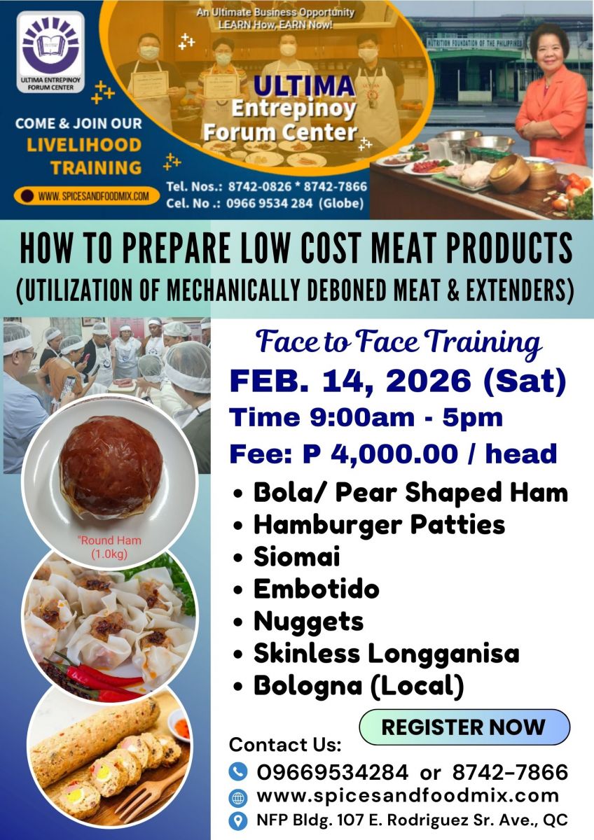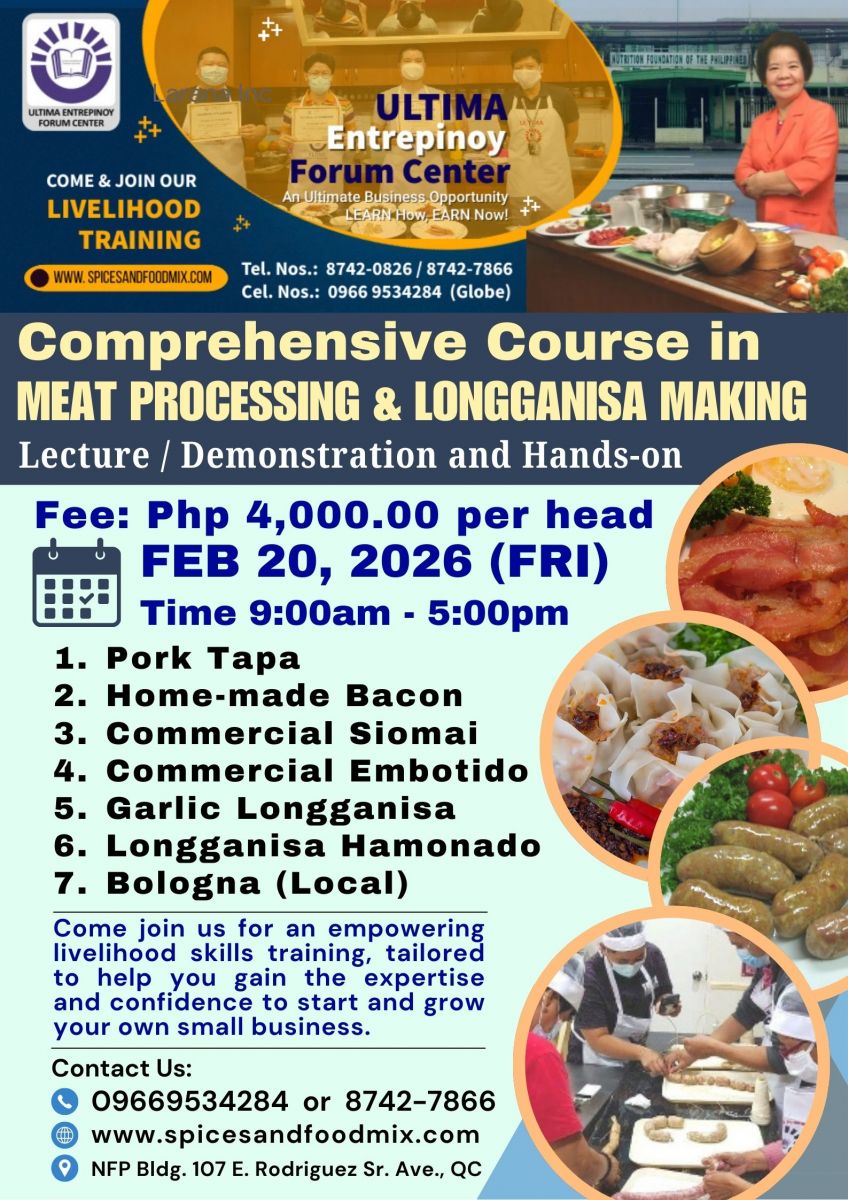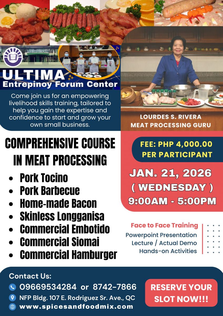 - Tutorial fee is Php 17,000.00 (good for 1 to 3 pax only), package cost of meat materials, ingredients and packaging needed, venue, machine/equipment, handouts/recipes, certificates
