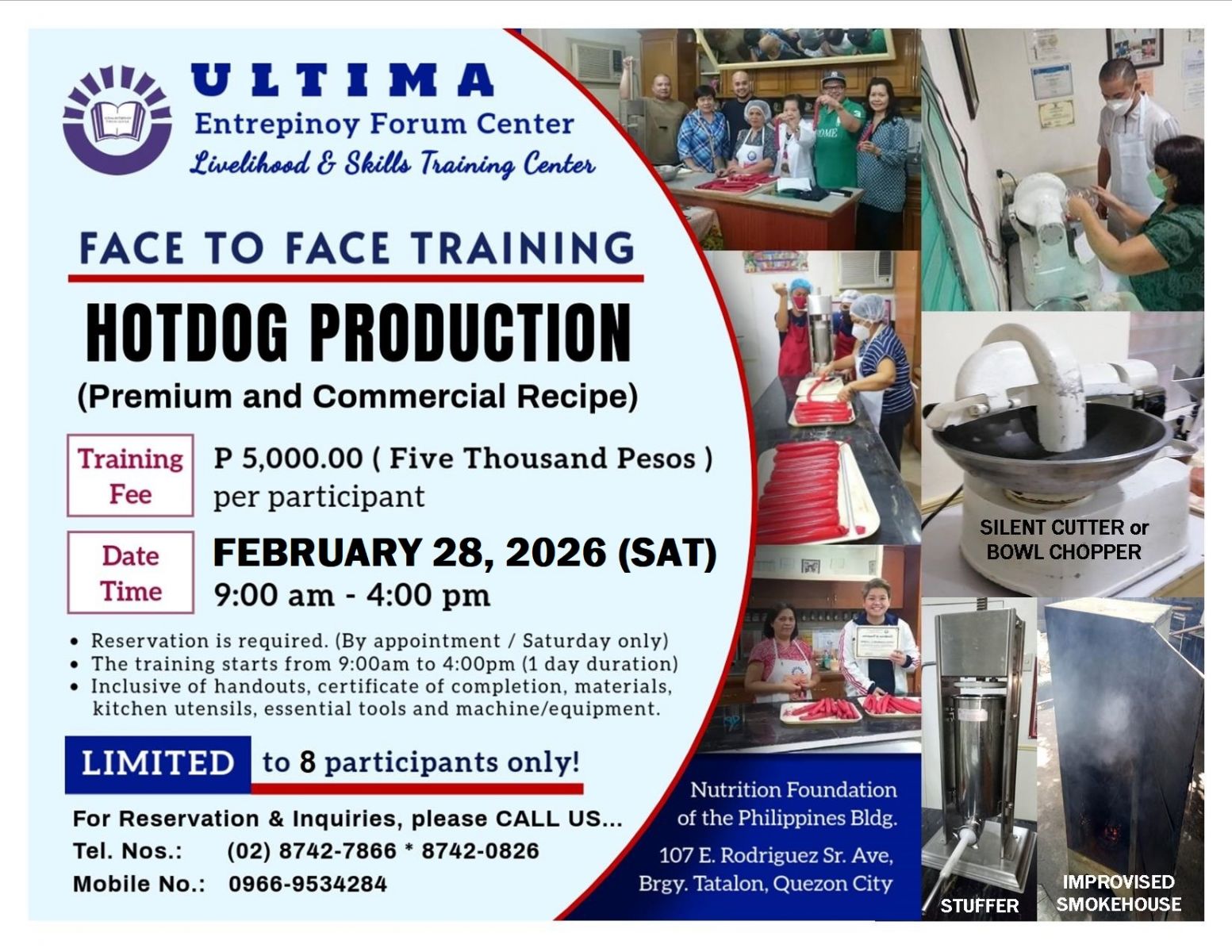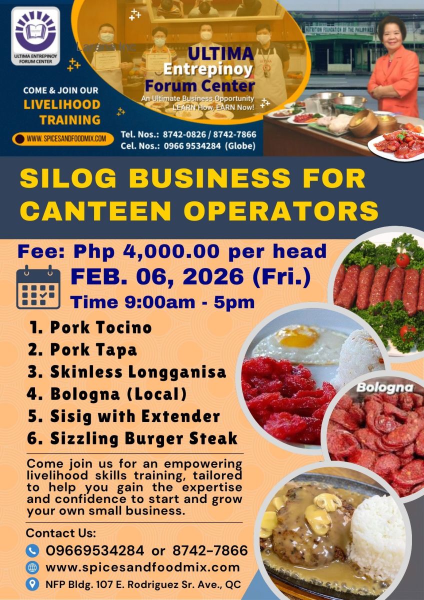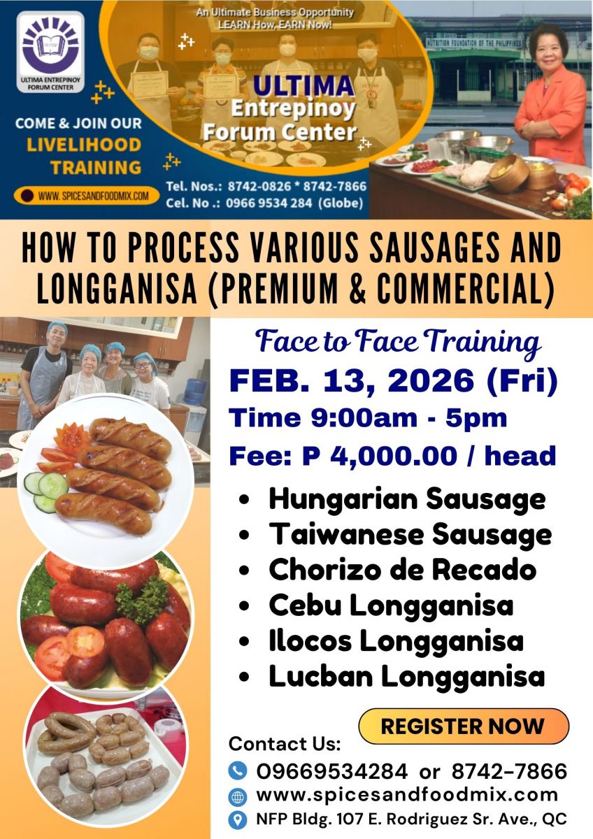 - Tutorial fee is Php 17,000.00 (good for 1 to 3 pax only), package cost of meat materials, ingredients and packaging needed, venue, machine/equipment, handouts/recipes, certificates