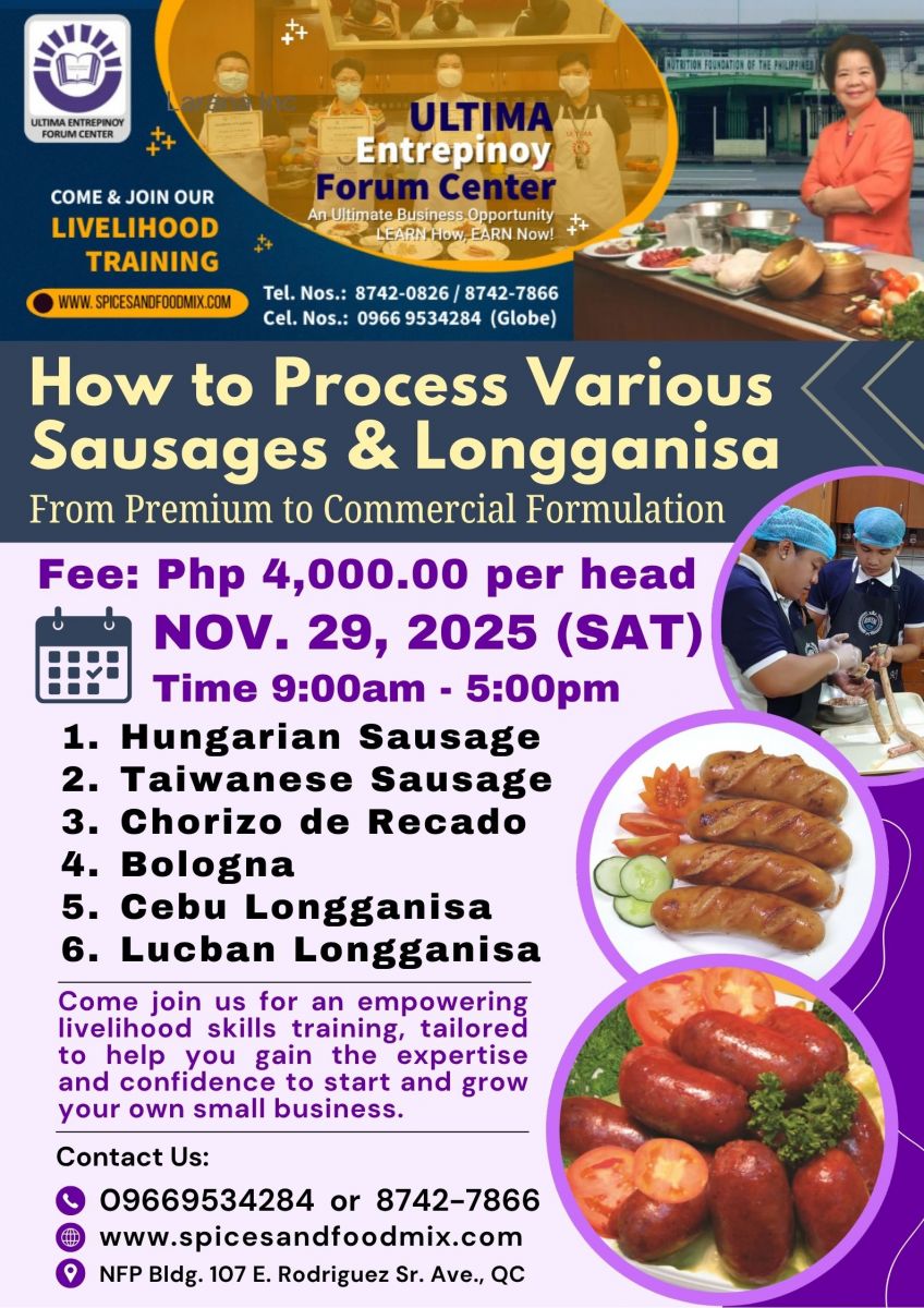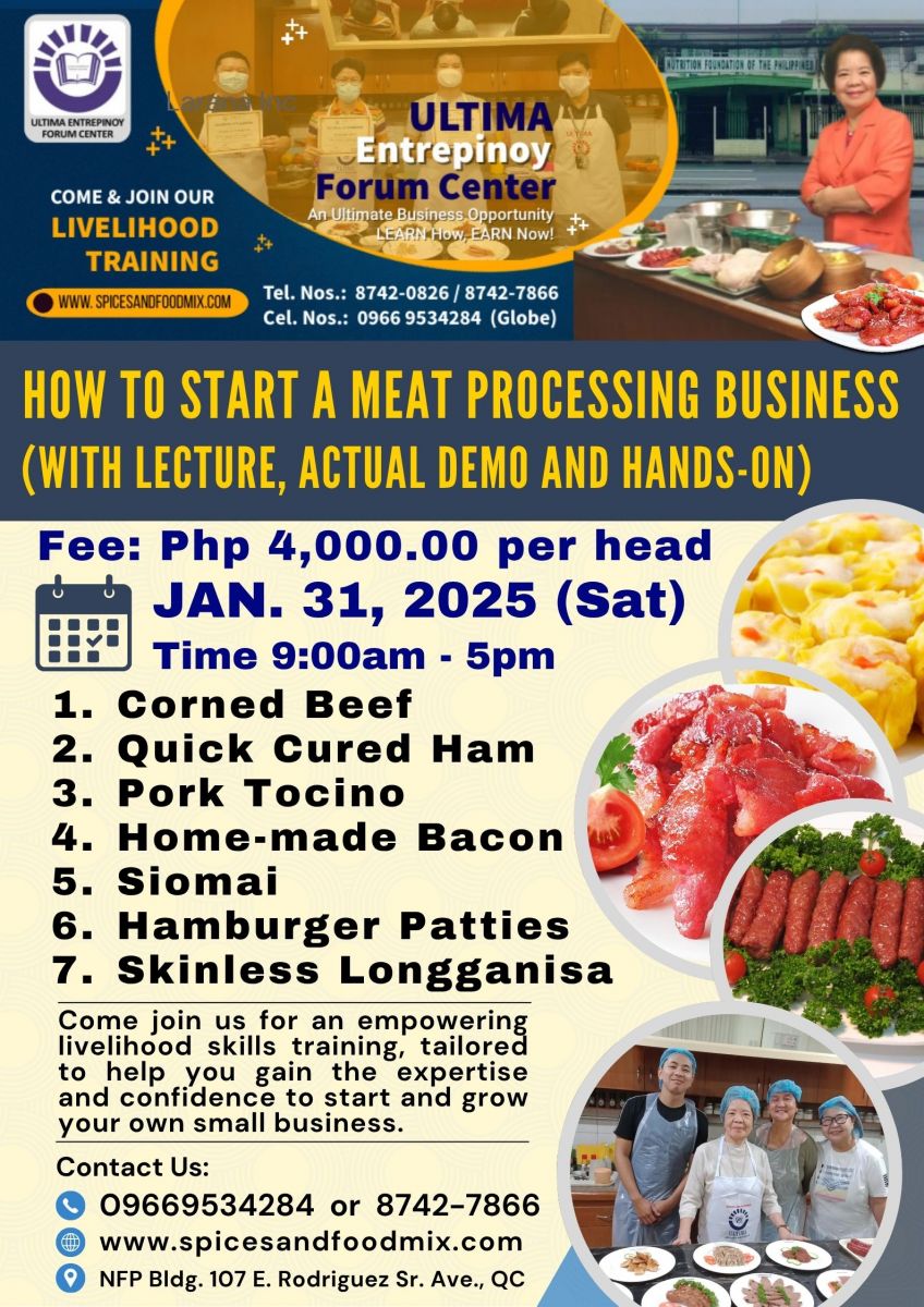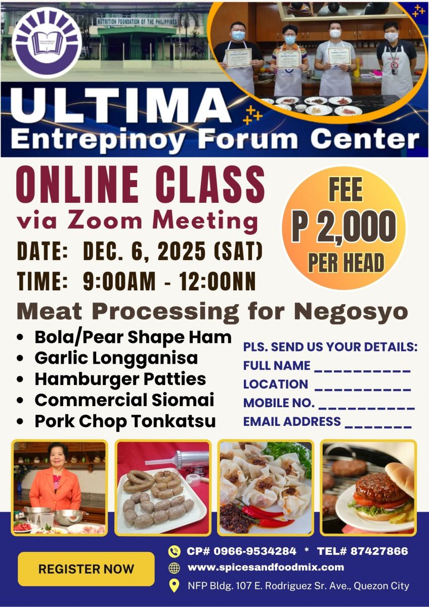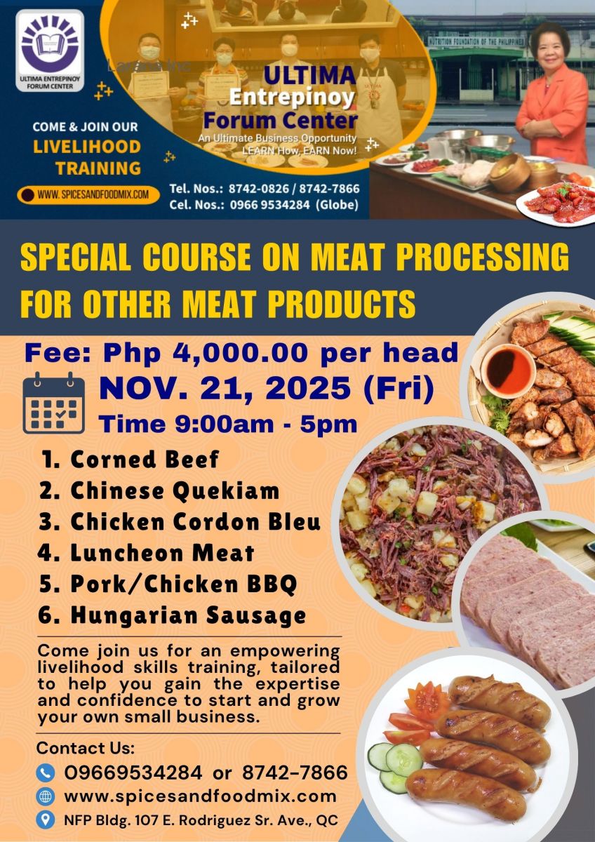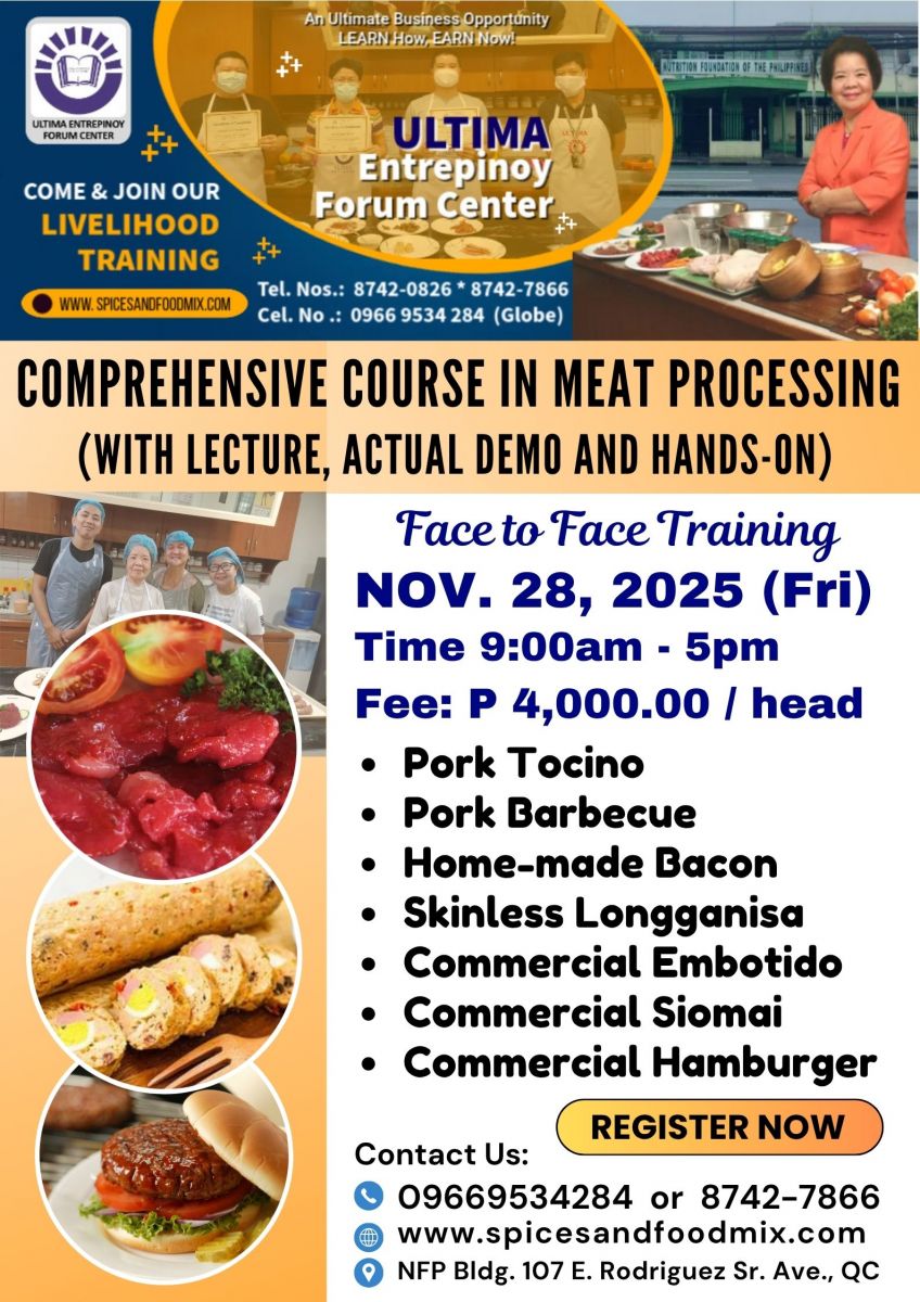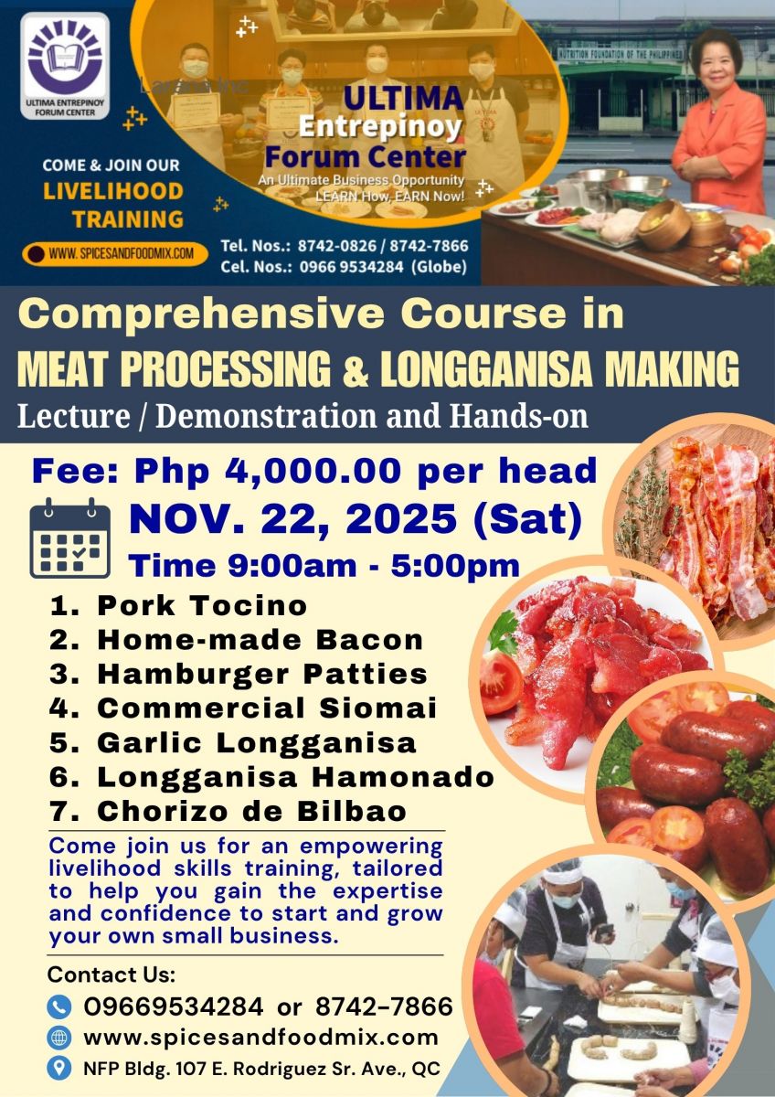 - Tutorial fee is Php 17,000.00 (good for 1 to 3 pax only), package cost of meat materials, ingredients and packaging needed, venue, machine/equipment, handouts/recipes, certificates