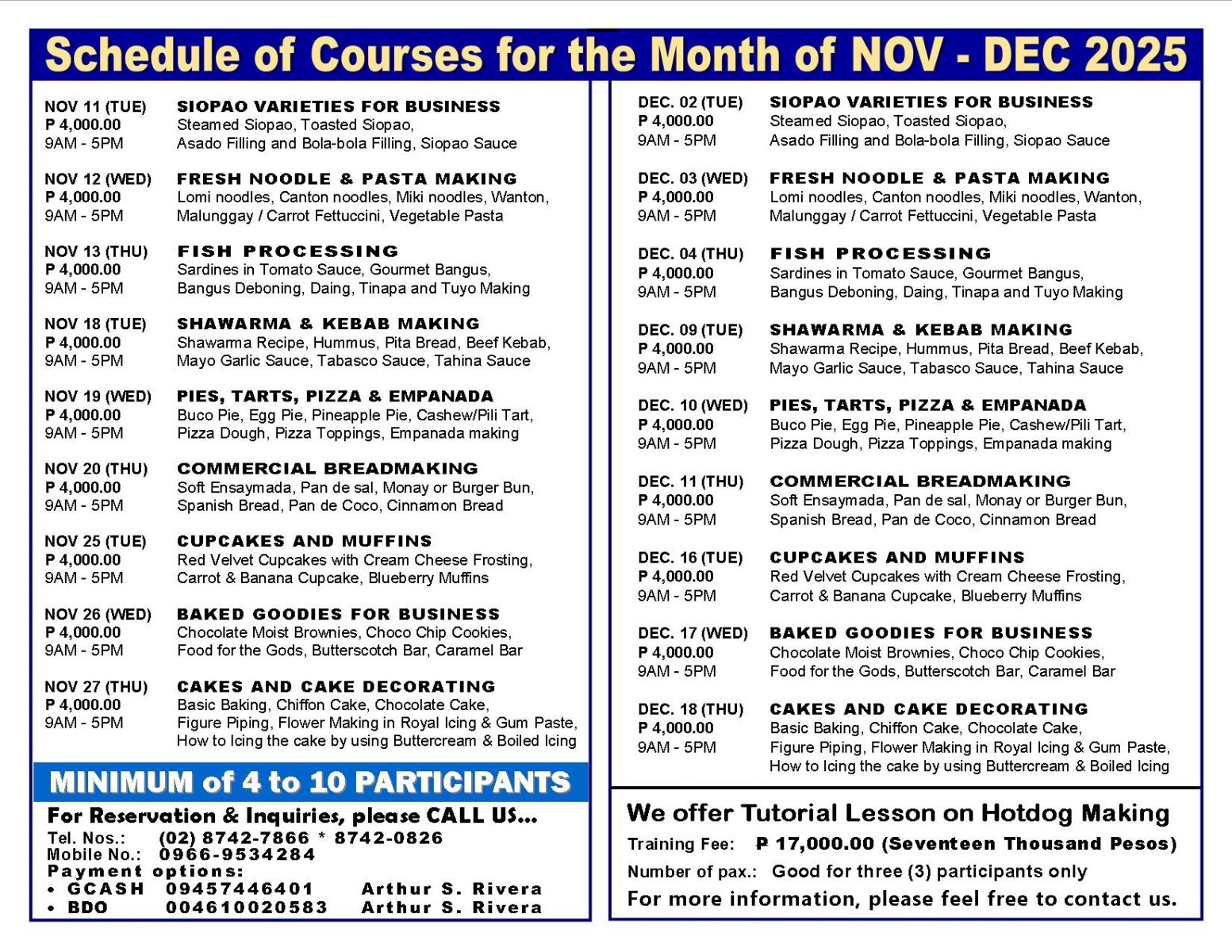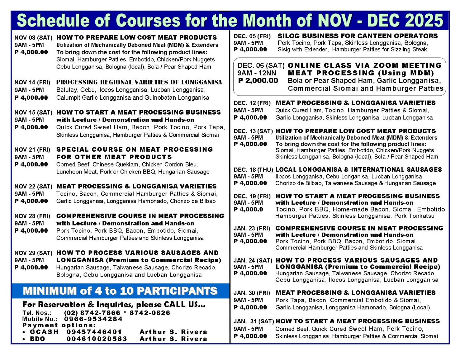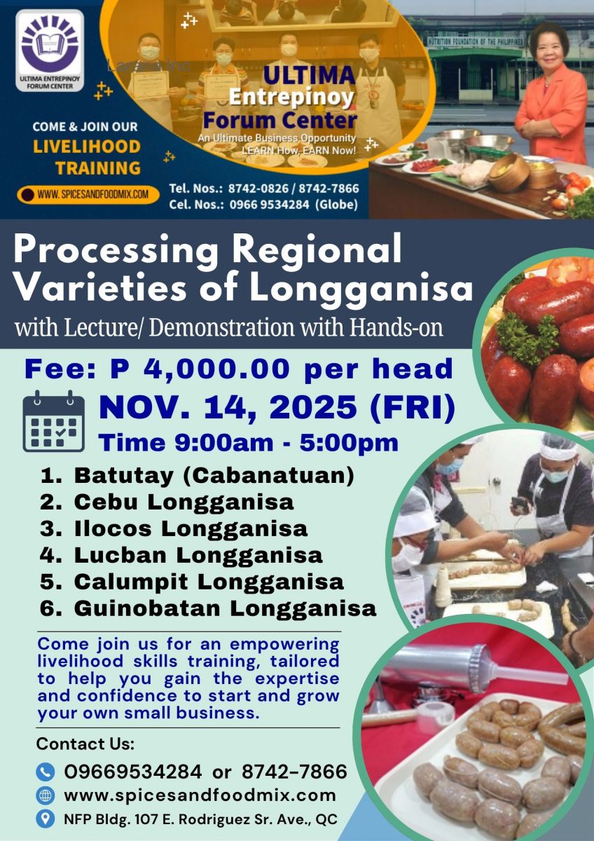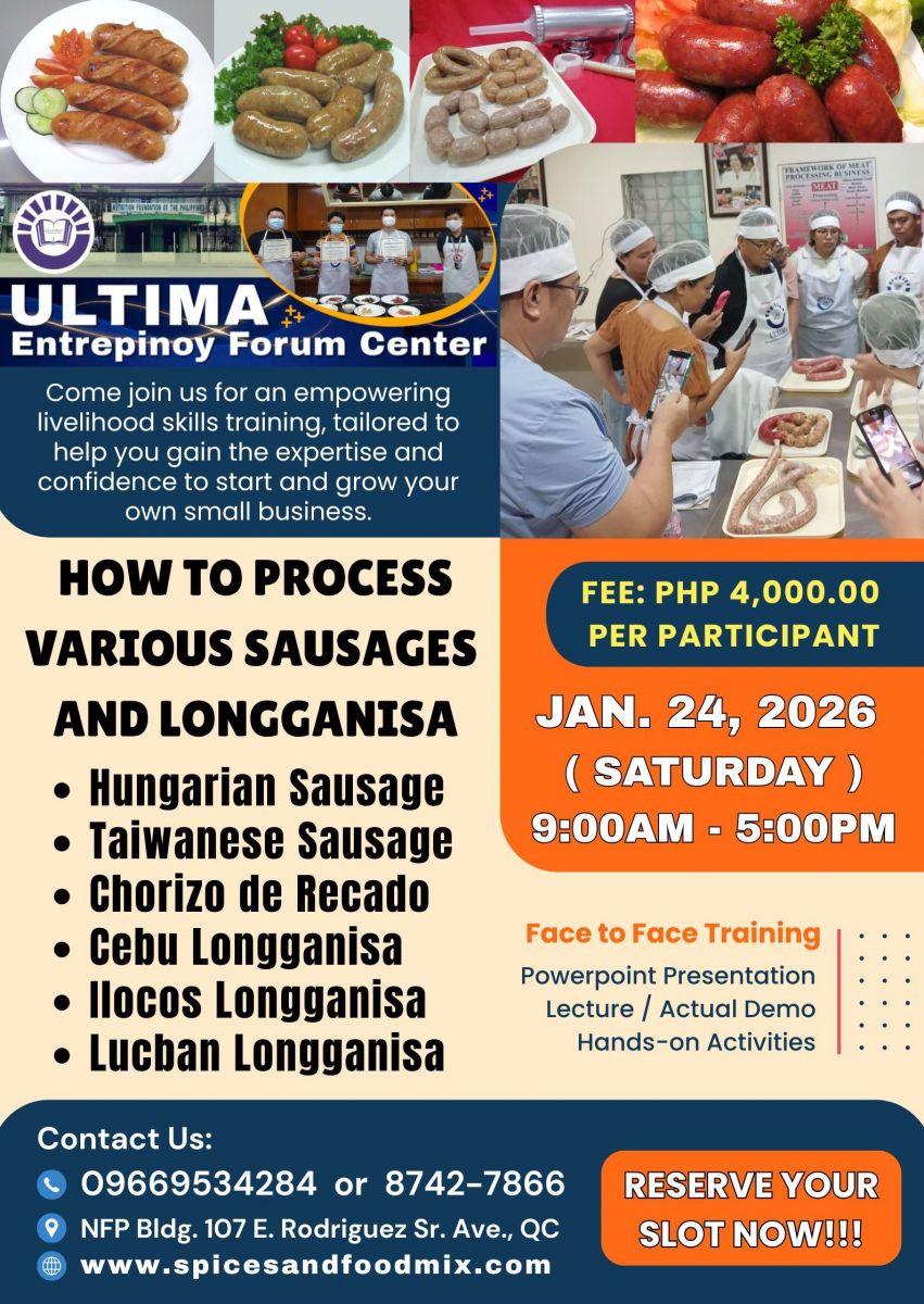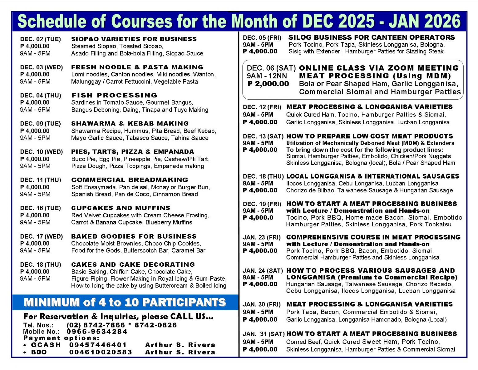 - Tutorial fee is Php 17,000.00 (good for 1 to 3 pax only), package cost of meat materials, ingredients and packaging needed, venue, machine/equipment, handouts/recipes, certificates