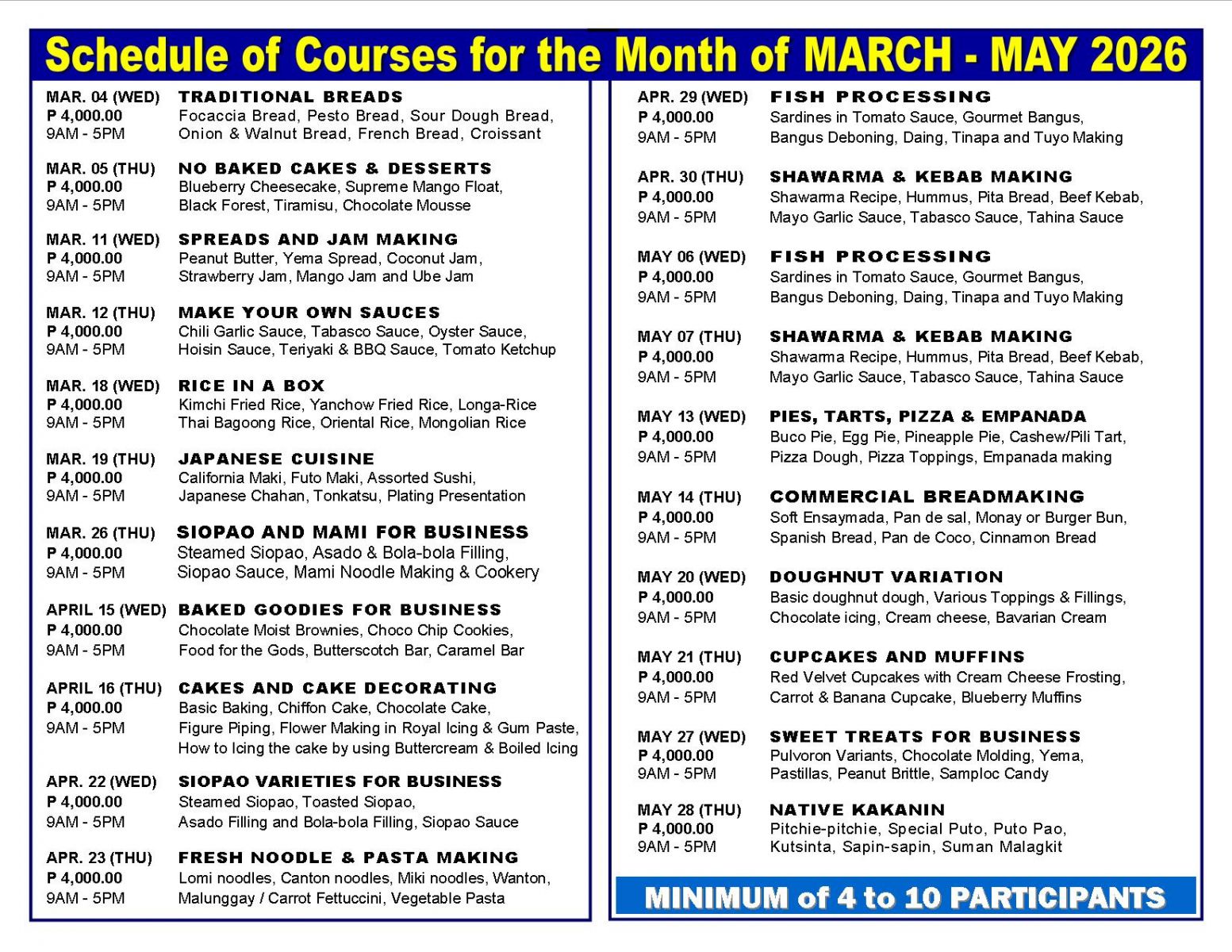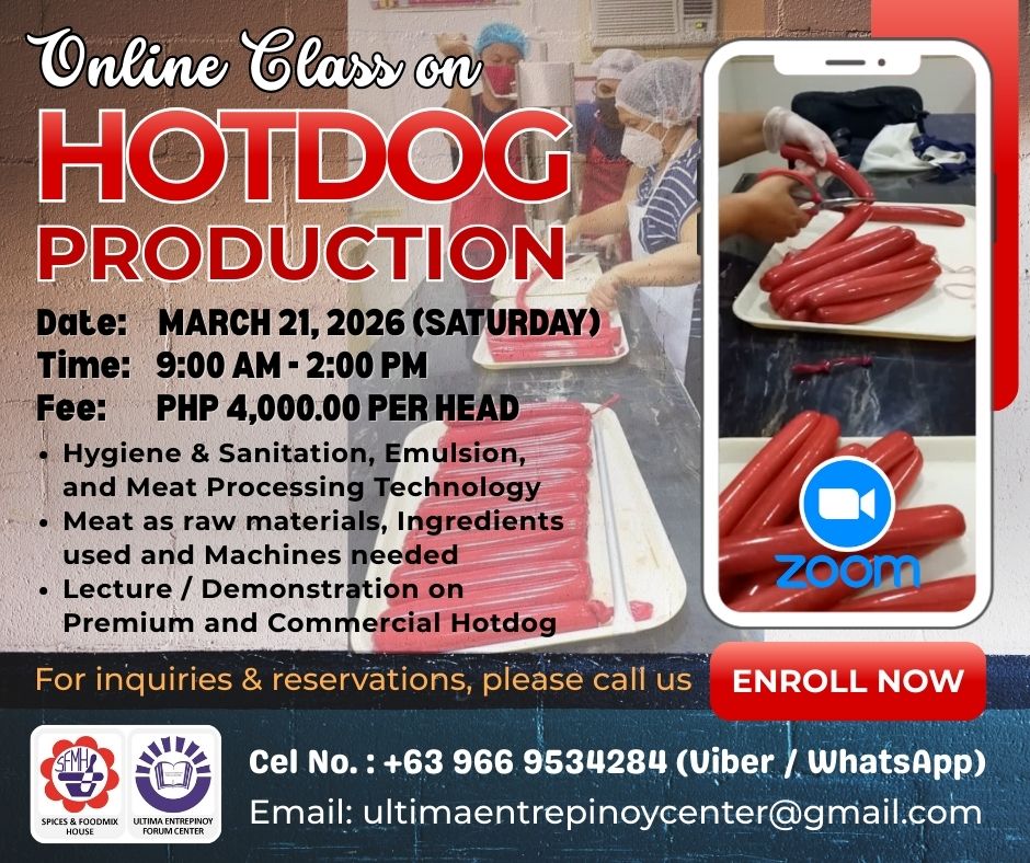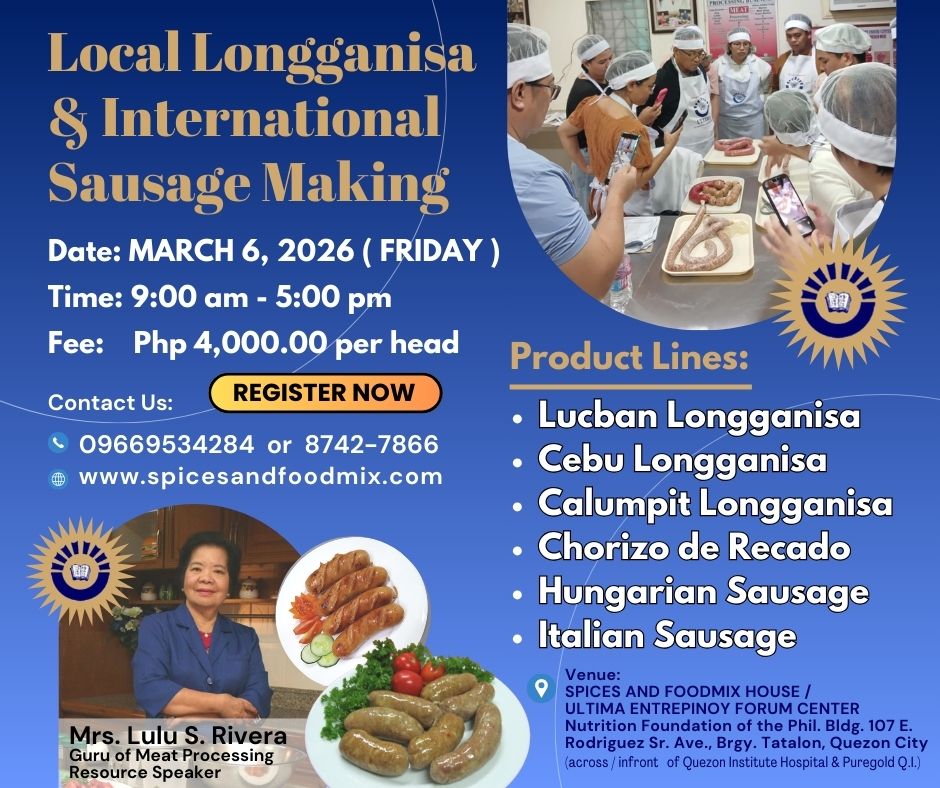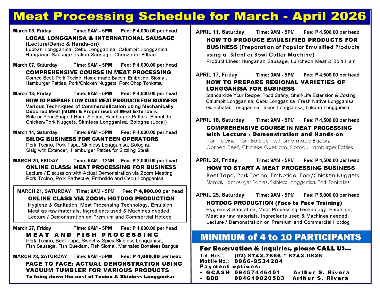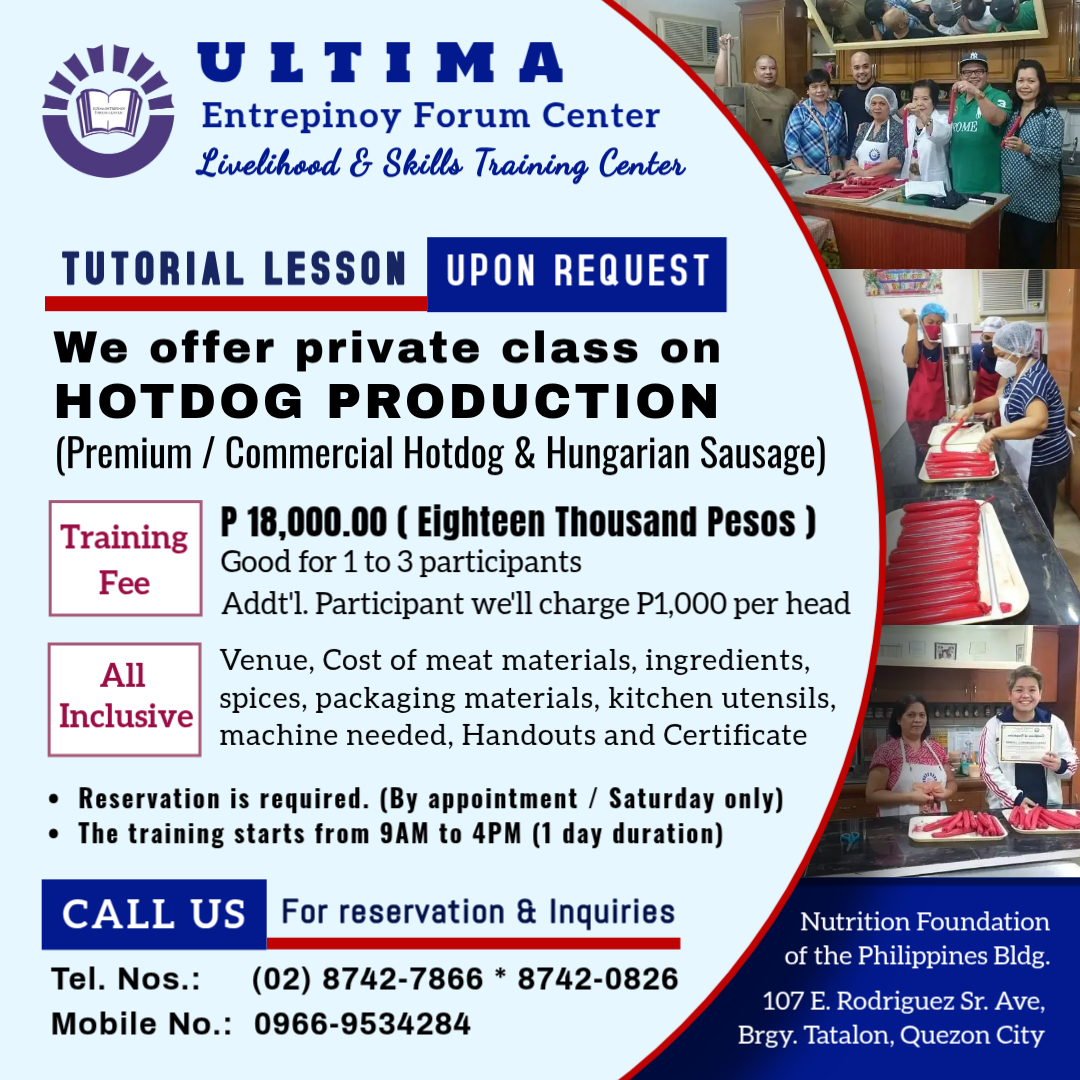 - Tutorial fee is Php 18,000.00 (good for 1 to 3 pax only), package cost of meat materials, ingredients and packaging needed, venue, machine/equipment, handouts/recipes, certificates
